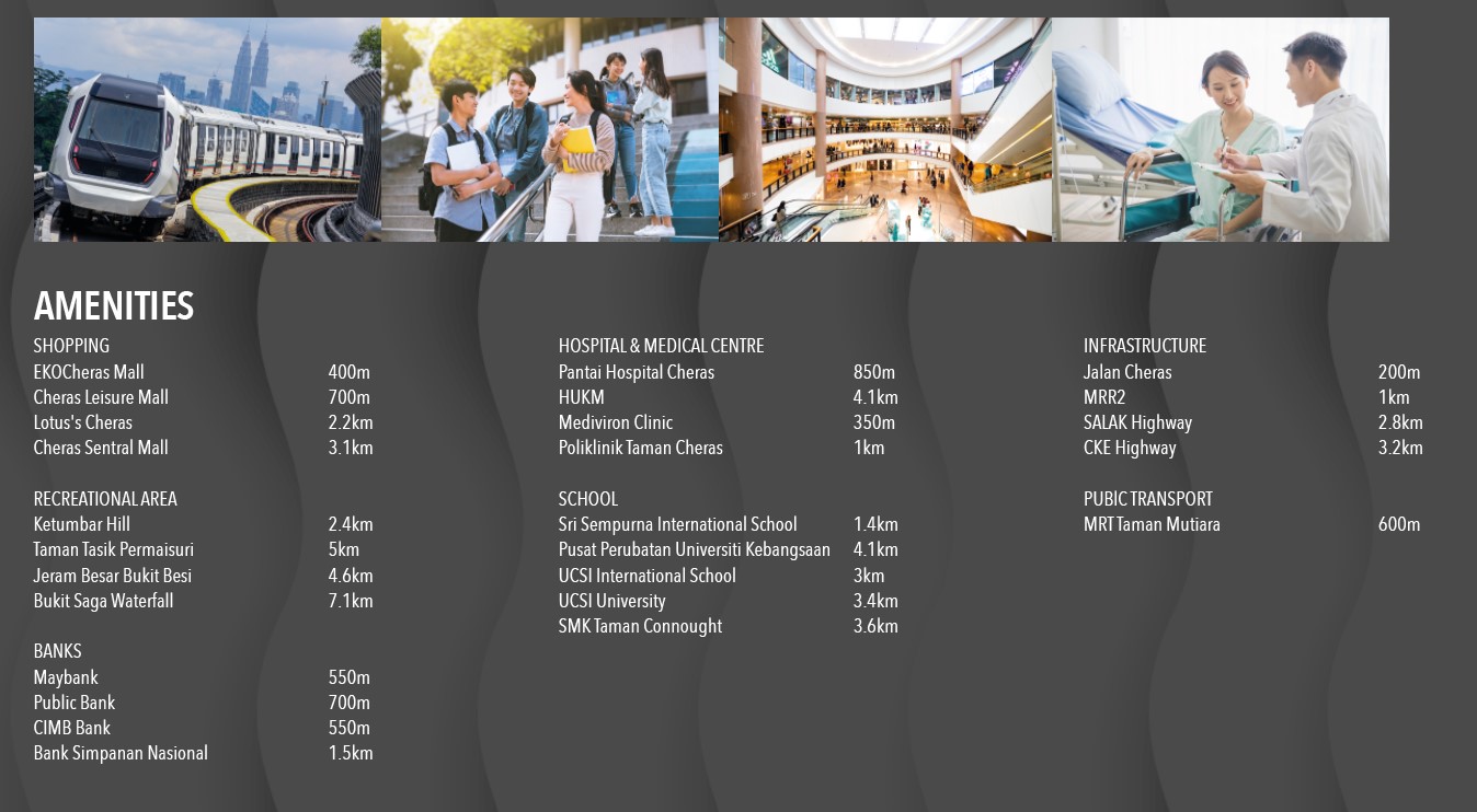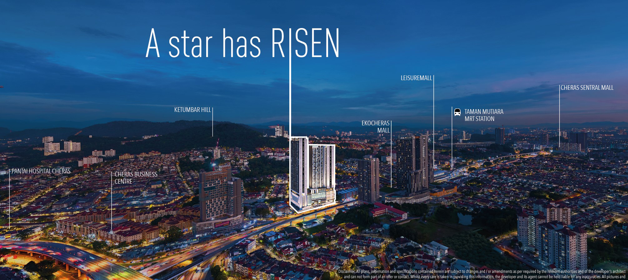 And now, Risen, the latest and proudest project of Maxim Global Berhad, strategically located in the heart of Cheras, Kuala Lumpur, accessible through major highways and MRT transportation. It consists total of 1,236 units of apartment which made up by 2 towers overlooking the wonderful Kuala Lumpur city skyline. Towering with Block A: 629 units and Block B: 607 units each, they are 54 levels sitting above multiple levels of 1,987 carparks.
